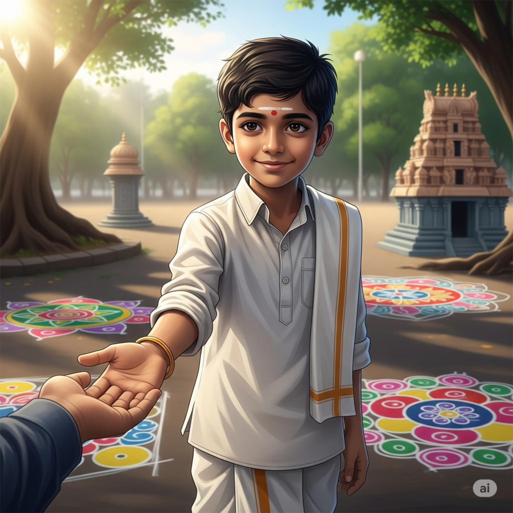 அந்த வழியாக ஒரு சிறுவன் வந்தான். அவன் ரோட்டருகே வளர்ந்து நின்ற புற்களை பறித்து கட்டாக கட்டி பசுவிற்கு கொடுத்தான்.