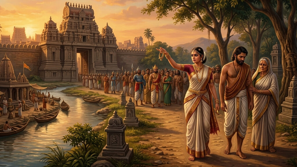 சோழநாட்டில் பிறந்து வளர்ந்த கண்ணகி, தனது திருமண வாழ்க்கையில் பலவிதமான சோதனைகளை அனுபவித்தாள். வாழ்க்கையில் அடுத்த கட்டத்தை நோக்கி பிழைப்பிற்காக சென்ற இடம்தான் பாண்டிய நாடு. அங்கே சென்றவள் மாற்றம் என்ற பெயரில் தன் கணவனின் உயிரை பறி கொடுத்தாள். அதன் பின்பு தனது கணவனோடு சேர்வதற்காக அவள் வந்தடைந்த இடம் தான் நம்முடைய சேர நாடு என்று பெருமிதத்தோடு கூறினார் மன்னர்.